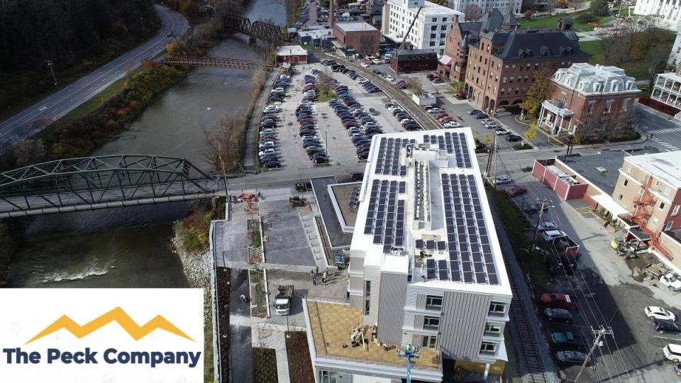 In 2019, the Peck Company installed two solar arrays on the roof of Housing Vermont buildings. Housing Vermont provides affordable rental housing to low-income Vermonters who are either working or retired. One of the projects The Peck Company installed was a 56kW array on the top of the new Housing Vermont Taylor Street Apartments building located on Taylor Street in Montpelier Vermont. Along with serving as a new building for Housing Vermont residence the first floor is also home to a transit center to allow for public and private transportation to be provided to locals.